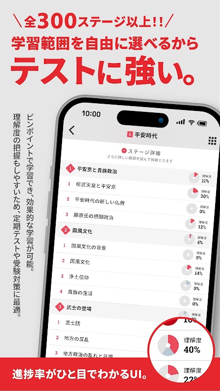 एक नज़र में विस्तृत क्षेत्र में प्रगति दर की जाँच करें। इसके अलावा, आप बड़े क्षेत्रों से लेकर छोटे क्षेत्रों तक, 300 से अधिक चरणों को स्वतंत्र रूप से चुन सकते हैं और सीख सकते हैं। चूँकि आप प्रश्नों की श्रेणी को विस्तार से चुन सकते हैं, यह नियमित परीक्षणों और परीक्षा की तैयारी के लिए आदर्श है।