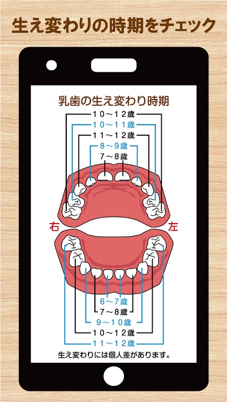 「乳歯おもいで箱」(乳歯ケース・アプリ)は乳歯の生え変わり時期や名称を確認できます。
