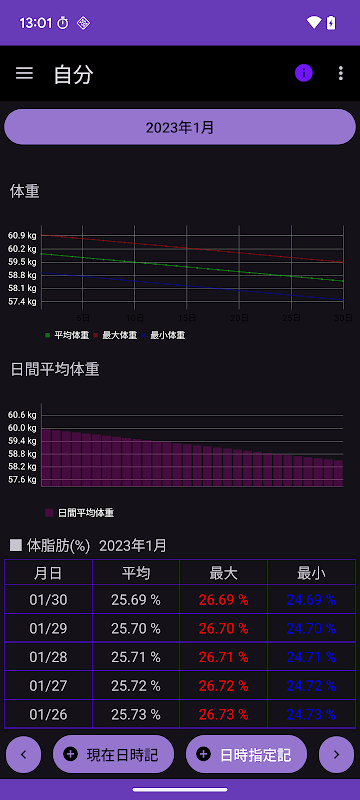 体重 体脂肪 記録帳 体重管理と体重グラフを表示します