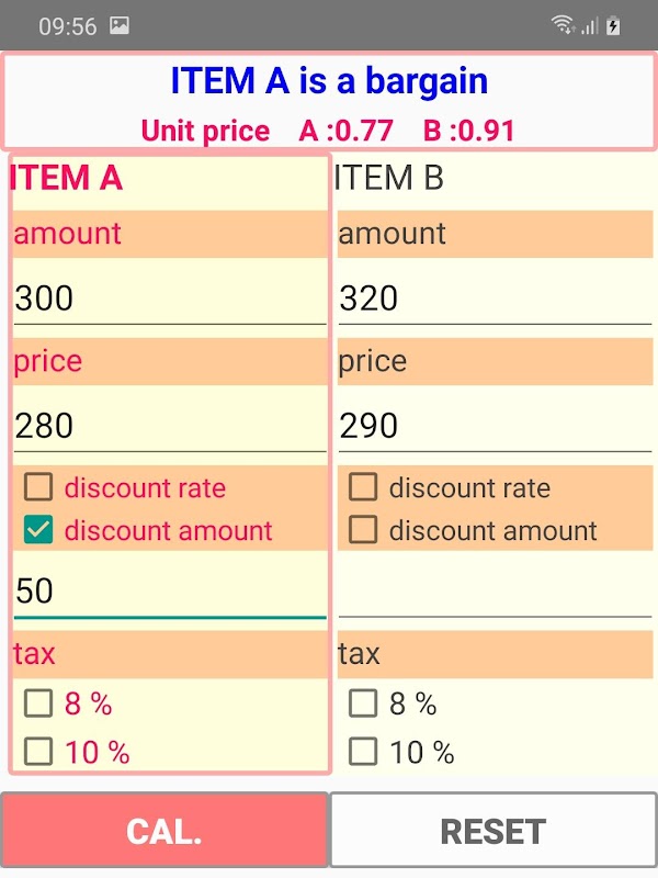 3. When you press the "Calculate" button, the amount per unit will be displayed and you will know immediately which one is better.