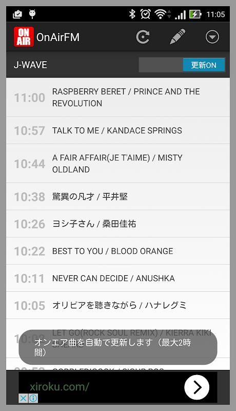 ・自動更新モード(更新ON):アプリ起動から2時間オンエア曲を自動で更新します