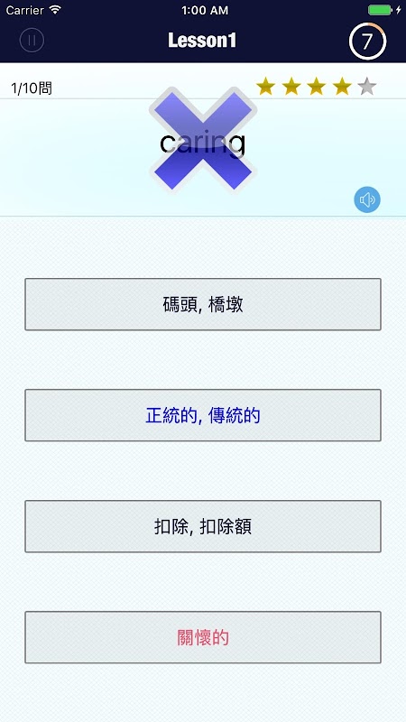 ・挑戰模式,只聽單詞發音,從8個選項中快速回答,非常刺激,讓你的心跳瞬間加速!
