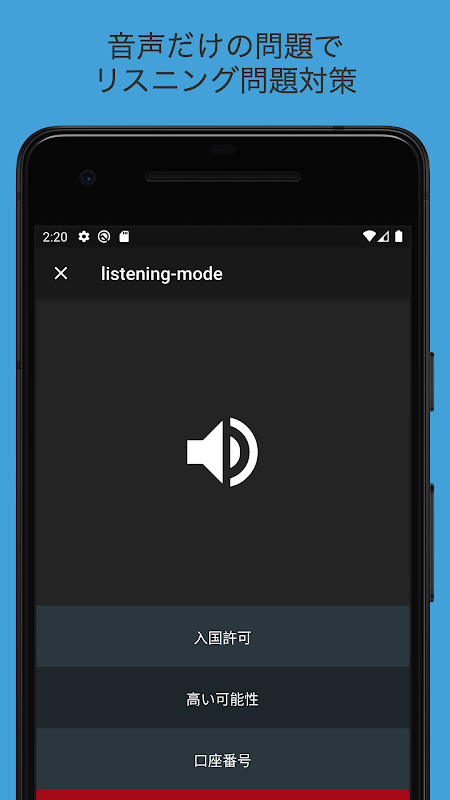 語彙はすべて成句(フレーズ)として出題されるため、無駄な時間を省き、最短で目標に到達できるようになっています。また、アプリに掲載されている語句はリスニング分野・読解分野で頻繁に出題されているものとなっているので、繰り返し学習する事で、両分野で高得点を狙う事が可能です。