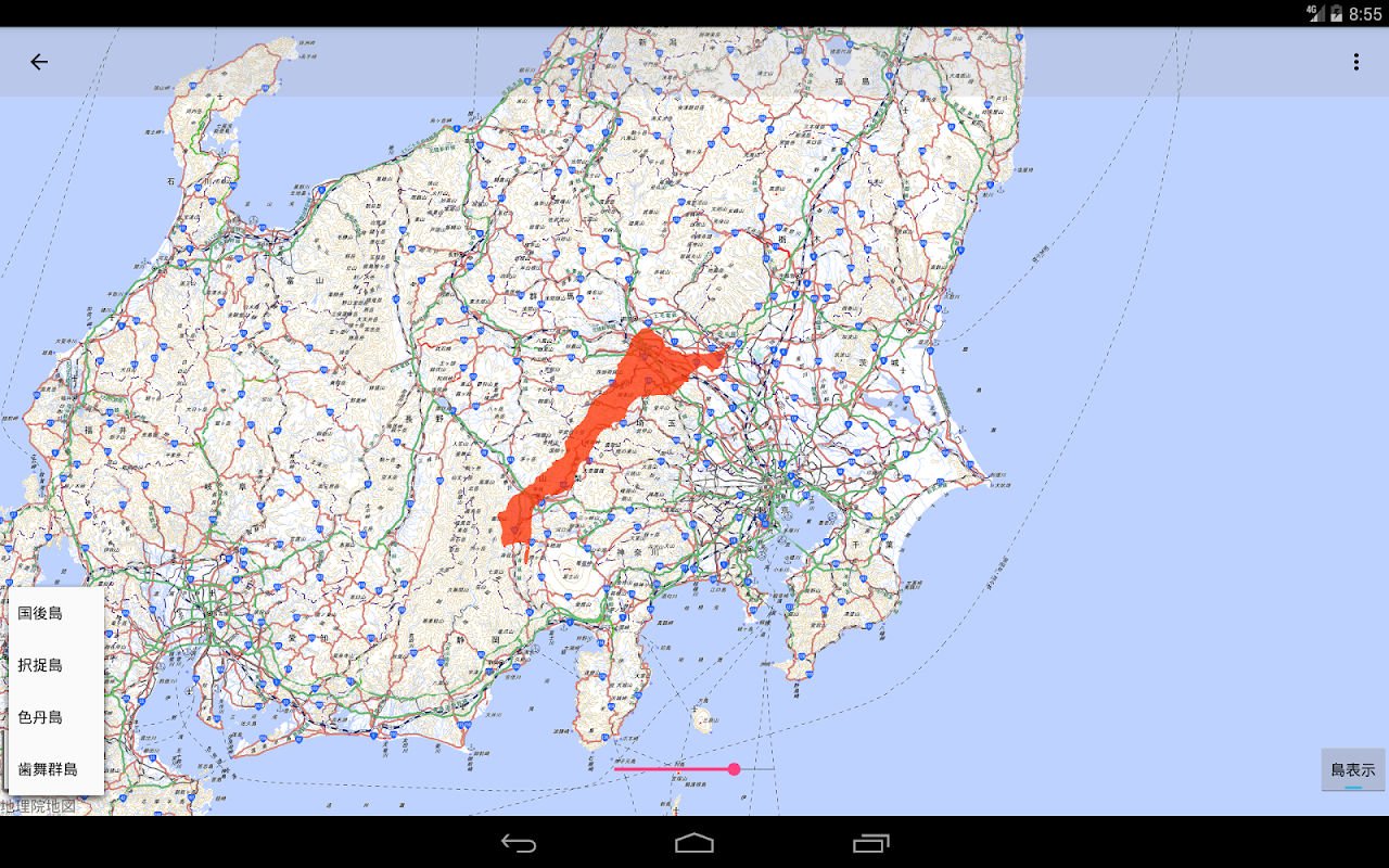● ベース地図は国土地理院の白地図または標準地図(*)を選択できます(地図の取得にインターネットアクセスが必要です)