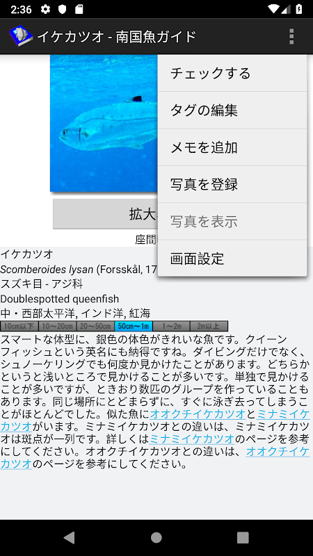 गोताखोरी और स्नॉर्कलिंग के दौरान ली गई पानी के नीचे की तस्वीरों पर आधारित एक मछली गाइड। 1718 प्रजातियां पंजीकृत हैं। मुझे लगता है कि डाइविंग लॉगिंग के लिए मछली की तस्वीर वाली किताब के विकल्प के रूप में इसका इस्तेमाल किया जा सकता है।