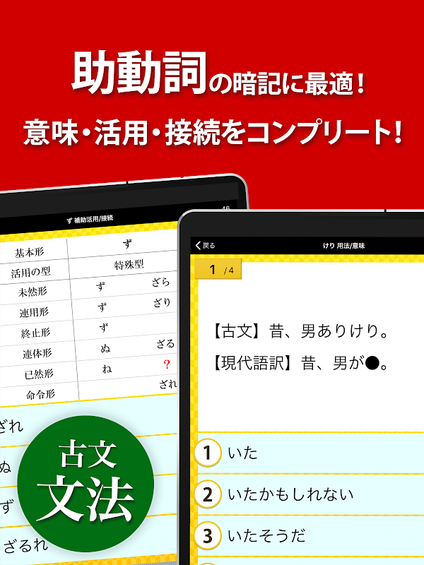 शास्त्रीय जापानी और चीनी क्लासिक्स पढ़ने वाले जूनियर हाई और हाई स्कूल के छात्रों के लिए ज़रूर देखें! "शास्त्रीय जापानी शब्दावली", "शास्त्रीय व्याकरण", "शास्त्रीय चीनी (वाक्यविन्यास)" और "शास्त्रीय चीनी (शब्दावली)" का अध्ययन करने के लिए एक निःशुल्क ऐप पेश है, जो सभी नियमित परीक्षाओं, प्रवेश परीक्षाओं और कॉमन टेस्ट में अक्सर पूछे जाते हैं!