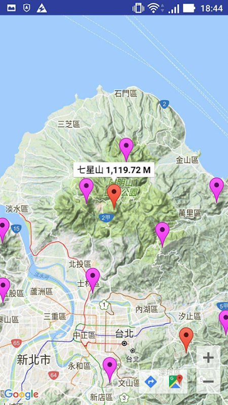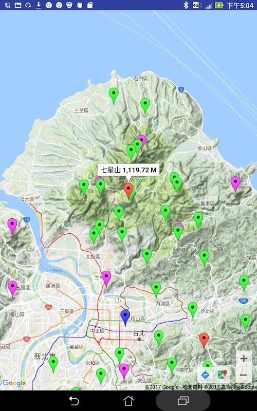 可選擇及呈現台灣大小山,包括一等二等三等及其他三角點共4千多筆資訊標誌於地圖上,並用不同顏色區別,點觸標誌可顯示山名及山高。一等:紅色,二等:紫色,三等:綠色,其他:黃色 (不支援Android 5以下)