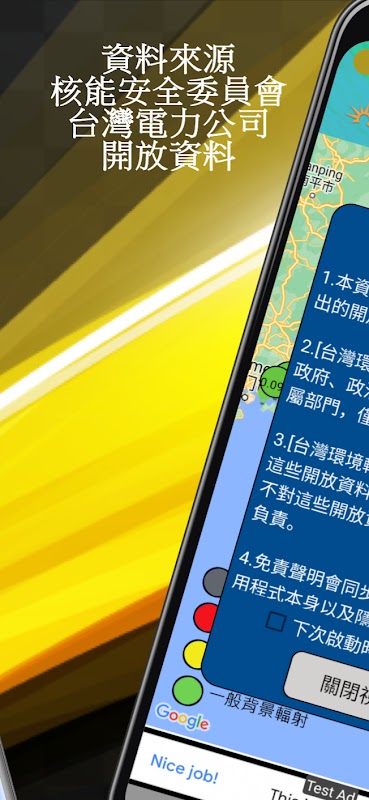 ● "ताइवान पर्यावरण विकिरण मानचित्र" एप्लिकेशन एक सरकारी एपीपी नहीं है और इसका सरकार से कोई संबंध नहीं है।