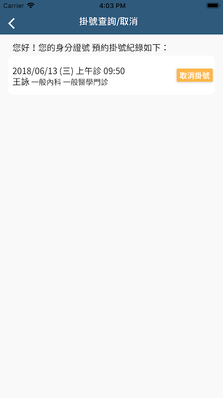 2. 查詢/取消: 可用身分證字號或病歷號碼及出生日期,查詢取消門診掛號。