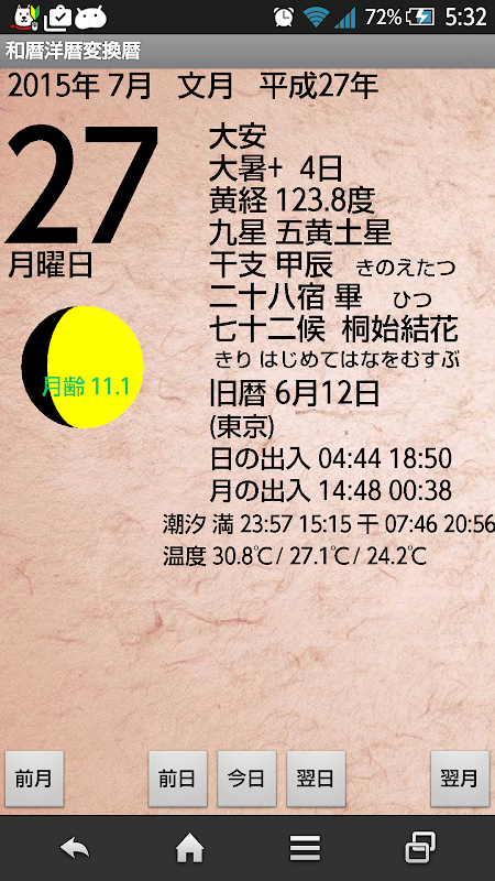 日付、曜日、旧暦、干支、六曜、月齢を表示します。