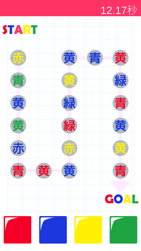 赤・青・黄・緑の4色のボタンを、文字の色または漢字の読みの通りに押していく脳トレゲーム!