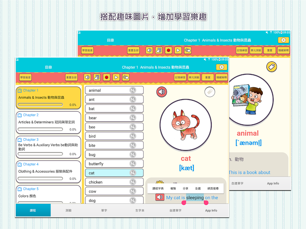 * 可自建使用者單字,並且作記憶和測驗練習。