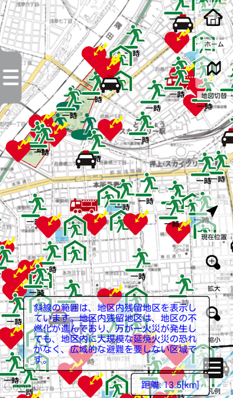 "सुमिदा वार्ड डिजास्टर प्रिवेंशन मैप" एक एप्लिकेशन है जो आपको अपने स्मार्टफोन पर टोक्यो के सुमिदा वार्ड में आपदा से बचाव की जानकारी ब्राउज़ करने की अनुमति देता है। आप GPS का उपयोग करके निकटतम निकासी आश्रय या निकासी स्थल की जांच कर सकते हैं।