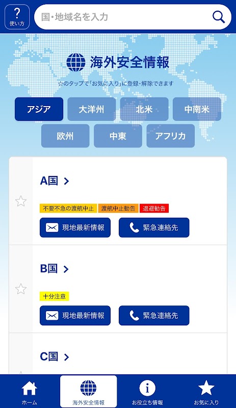 And वर्तमान स्थान और आसपास के देशों / क्षेत्रों के लिए खतरे की जानकारी (निकासी सलाह, यात्रा संबंधी सलाह, आदि) और यात्रा जानकारी (स्पॉट जानकारी, व्यापक क्षेत्र की जानकारी, स्थानीय नवीनतम जानकारी) प्रदर्शित करने के लिए स्मार्टफोन के जीपीएस फ़ंक्शन का उपयोग करता है।