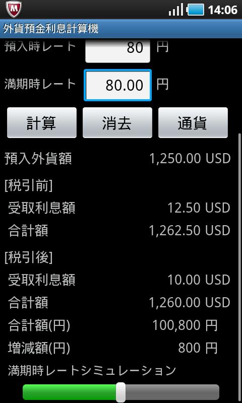 ・計算ボタンを押下後に表示される満期時レートシミュレーションバーを使用することによって、満期時の円貨額をシミュレーションすることができます。