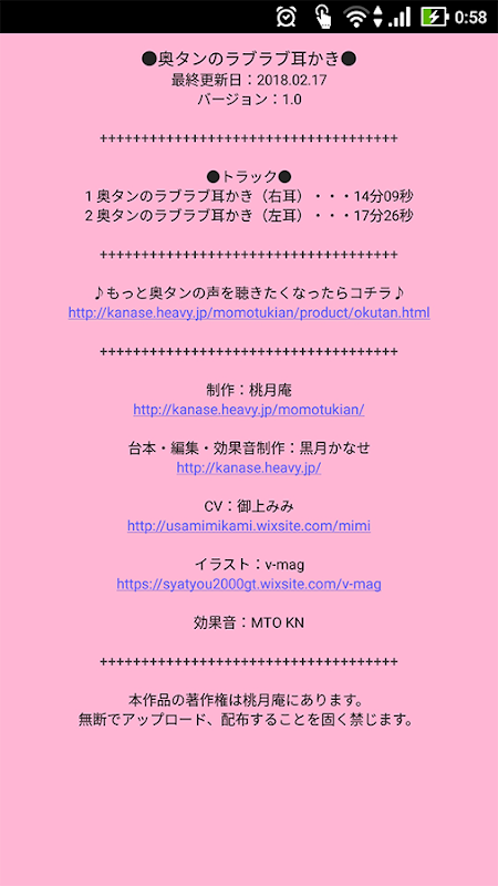 旦那ちゃん(アナタのことですよ)のことが大好きな奥タンが、お耳を耳かきする音声が楽しめるアプリです。