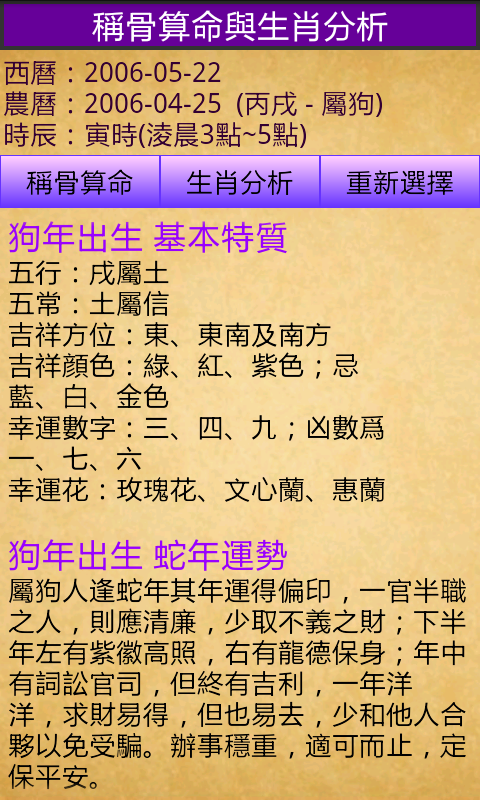 जन्मतिथि भाग्य-बताने में युआन तियांगंग की हड्डी-वजन वाली भाग्य-बताने वाली विधि का उपयोग किया जाता है। पश्चिमी कैलेंडर के जन्मदिन का समय दर्ज करें, और सिस्टम स्वचालित रूप से इसे चंद्र कैलेंडर में परिवर्तित कर देगा। जन्म वर्ष, महीने, दिन और चंद्र के समय के अनुसार कैलेंडर, यह किसी व्यक्ति के जीवन का अच्छा या बुरा भाग्य, सम्मान और अपमान निर्धारित कर सकता है, और लोगों को प्रवृत्ति का पालन करने में सक्षम बनाता है। शुभकामनाएँ और दुर्भाग्य से बचें।