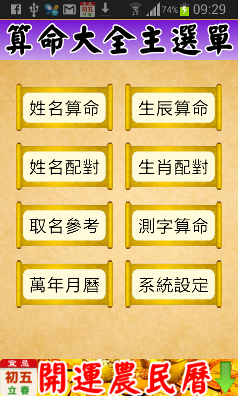 इस कार्यक्रम में पारंपरिक चीनी और सरलीकृत चीनी संस्करण शामिल हैं। भाग्य बताना भविष्यवाणी का एक विज्ञान है। यह प्रणाली भविष्य के भाग्य की भविष्यवाणी करने के लिए नाम, जन्मतिथि और शब्द भविष्यवाणियों का उपयोग करती है, ताकि लोग अच्छी किस्मत की तलाश कर सकें और बुरी किस्मत से बच सकें।