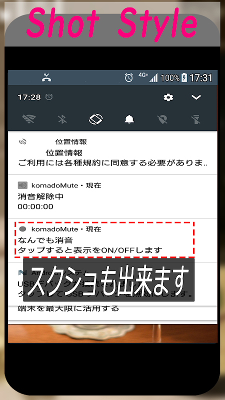 ・消音動作時をメッセージのみにしたり、消音ボタンを自由な位置に表示・移動することも出来ます。