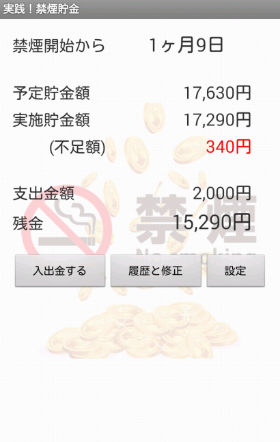 タバコをやめたその日からタバコのお金を貯金しましょう!現在までの予定貯金額と実施した貯金額が比較できます。貯めたお金を使った金額も記録できます。
