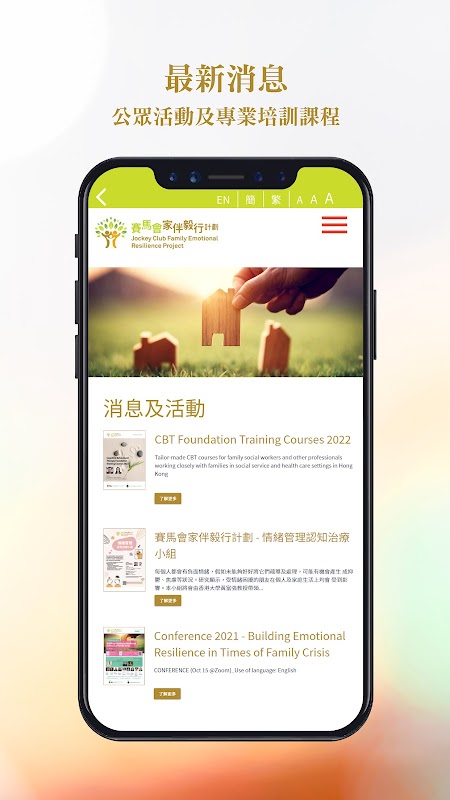 नियोजित ऑनलाइन प्लेटफॉर्म जनता और जरूरतमंद लोगों को पारिवारिक भावनात्मक लचीलापन और संज्ञानात्मक व्यवहार थेरेपी पर ज्ञान और कौशल प्रदान करेगा। अनुभवी सामाजिक कार्यकर्ताओं की एक टीम द्वारा संकलित ऑनलाइन स्व-अध्ययन पाठ्यक्रम जनता को व्यक्तिगत भावनात्मक स्वास्थ्य में सुधार करने और समय और स्थान की परवाह किए बिना पारिवारिक भावनात्मक लचीलापन को मजबूत करने के लिए कौशल सीखने की अनुमति देता है। वेबसाइट में मनोवैज्ञानिक परीक्षण और विश्लेषण भी हैं, ताकि हर कोई व्यक्ति के मानसिक स्वास्थ्य को वास्तविक समय में समझ सके।