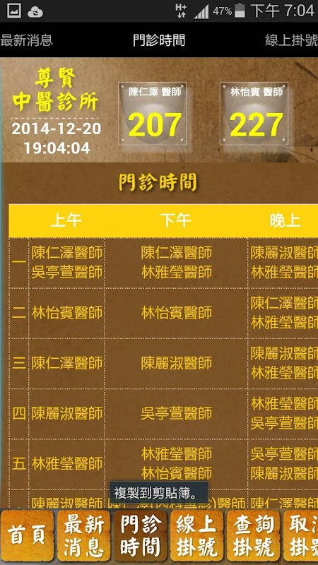 本診所進門時即聽到輕快響亮的問候聲,隨即有 服務人員送上茶飲,坐在寬敞明亮的候診室內, 喝著診所特別現煮的中藥養生茶,在輕鬆的背景 音樂中,面對醫師和藹親切的態度,您可以卸除 心防與醫師討論病情,在醫師詳細的望、聞、問 、切解說下,可以更容易了解自己的身體狀況, 並了解自己的體質,找到最合適自己的養生保健 資訊。