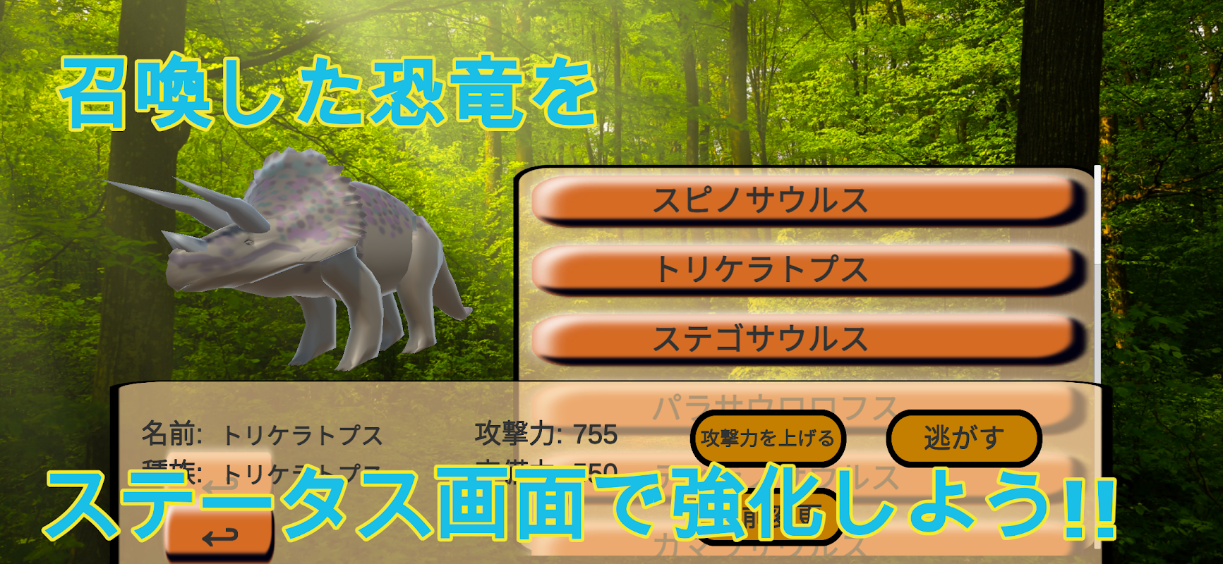 इस खेल में डायनासोर की ताकत उनकी आक्रमण और रक्षा शक्ति से निर्धारित होती है। स्टेटस स्क्रीन पर हमले की शक्ति को मजबूत किया जा सकता है।
