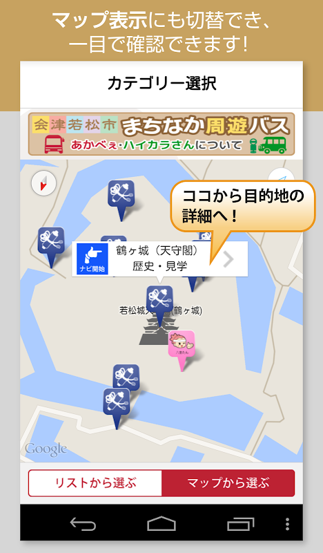 会津若松市まちなか周遊バス「あかべぇ・ハイカラさん」を利用したナビができます。