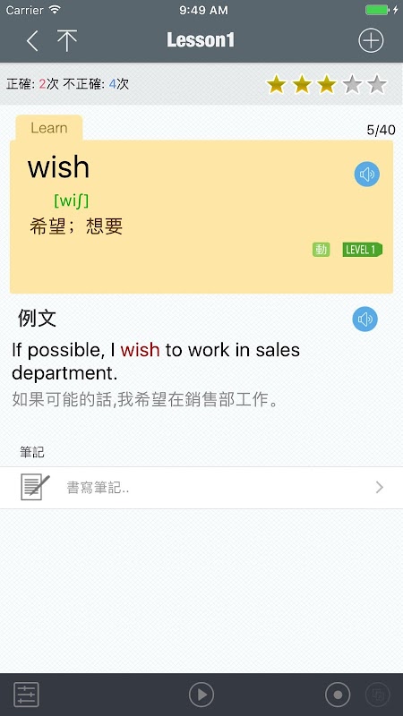・錄音功能可以讓您在學習的時候錄下自己的聲音進行照,同時也可以使用備注功能寫下自己對單詞一理解或注釋。