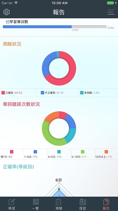 所有的學習和測驗過程都有記錄並用圖表展示,讓你對自己的學習進度一目瞭然!
