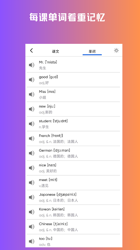 3. कक्षा-आधारित शब्द: प्रत्येक पाठ में आसानी से याद करने के लिए मुख्य शब्द होते हैं। शब्दकोश विवरण पर जाने के लिए किसी शब्द पर क्लिक करें, तथा शब्दावली पुस्तक में जोड़ने के लिए किसी शब्द को देर तक दबाएँ।