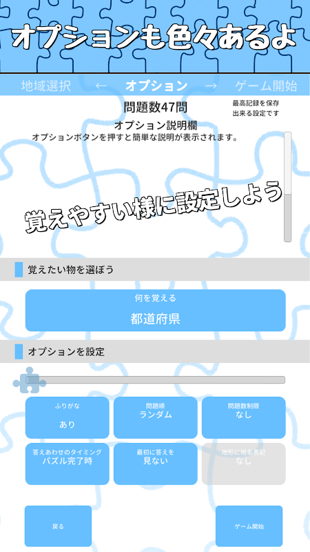 地名をピースにしてパズル感覚で遊んで覚えるアプリだよ。 初めて学ぶ人も学びやすい工夫がいっぱい!!