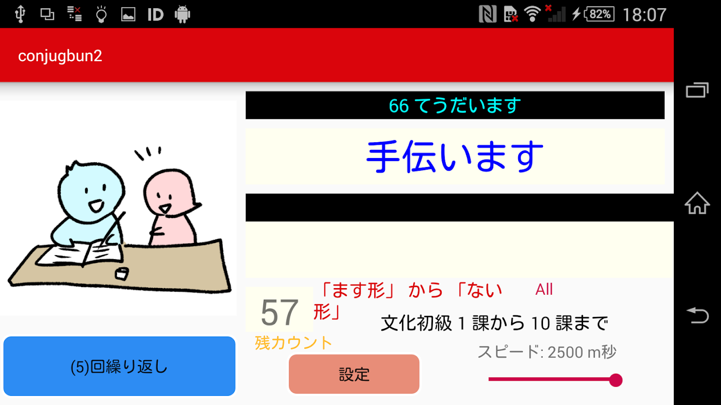 日本語初級者向けのフラッシュカード型の動詞活用練習アプリです。 「辞書形」「ます形」「て形」「ない形」の相互変換練習ができます。 7,10インチタブレットも対応