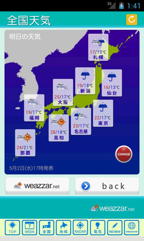 · सप्ताह मौसम पूर्वानुमान (जापान मौसम विज्ञान एजेंसी 11:17 हर दिन 5 में घोषणा)