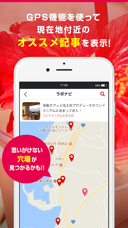 ナビ機能で近くの観光スポットやオススメ飲食店がすぐわかる!さらに記事を読んでポイントを貯めると、素敵な沖縄グッズが当たるプレゼントに応募できる!写真投稿もOK!