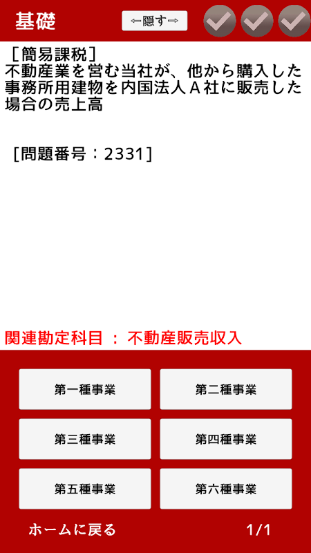 यह ऐप एक प्रश्न-उत्तर शैली समस्या संग्रह ऐप है जो उपभोग कर कानून के तहत विभिन्न लेनदेन के प्रबंधन का न्याय करने की आपकी क्षमता को प्रशिक्षित करता है। जैसा कि नीचे दिखाया गया है, आप खाली समय का उपयोग करके आसानी से और कुशलता से अध्ययन कर सकते हैं, बिल्कुल एक प्रश्नोत्तरी खेल को हल करने की तरह।