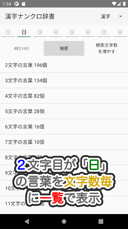 यदि आप "1" शब्द को पहले वर्ण के रूप में और "1" को तीसरे वर्ण के रूप में खोजते हैं, तो "Ichisei Ichidai", "Ichigo Ichikai", और "One word one वाक्यांश" जैसी एक सूची प्रदर्शित की जाएगी।