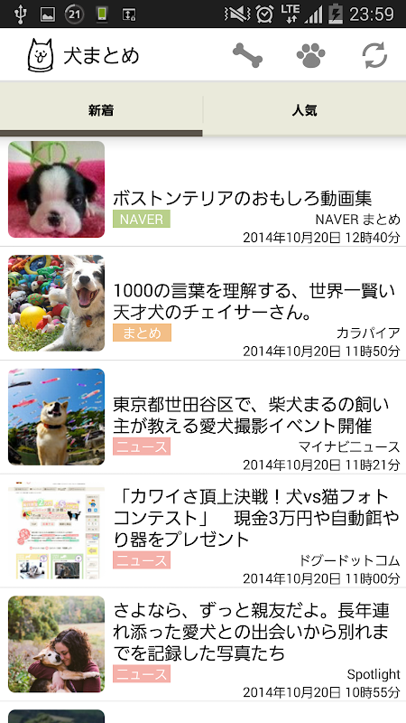 新着順だけでなく人気順で話題の犬ニュースを素早くチェックできます。