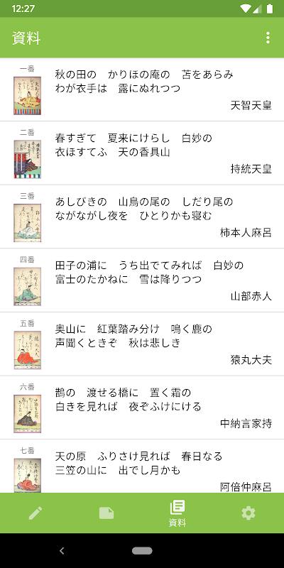 百人一首の総復習として全百首がランダムに出題されます。結果は最大十回まで端末に保存され、過去間違えた問題だけ練習することもできます。