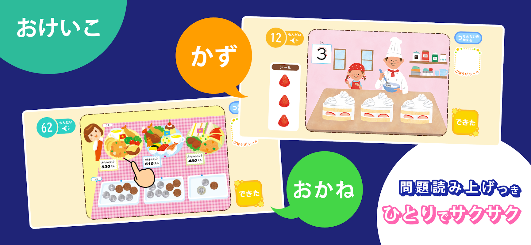 मोजी, काज़ू और ची के अलावा, अंग्रेजी और पैसा जैसे कई अन्य विषय भी हैं। सुंदर चित्र पुस्तक जैसी तस्वीरों और समस्या वर्णन के साथ, यहां तक कि बच्चे भी स्वयं इस पर काम करने का आनंद ले सकते हैं।