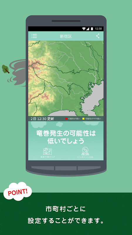 "त्सुमाकी अलर्ट" एक ऐसा एप्लिकेशन है जो आपको पॉप-अप या सूचना पट्टी द्वारा सूचित करता है जब सेट क्षेत्र में एक बवंडर की संभावना होती है।