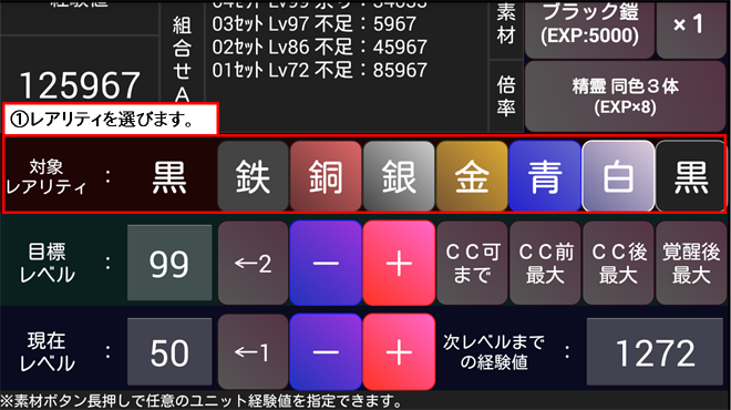 選択中のレアリティに合わせて、各状態の最大レベルを自動指定できます。