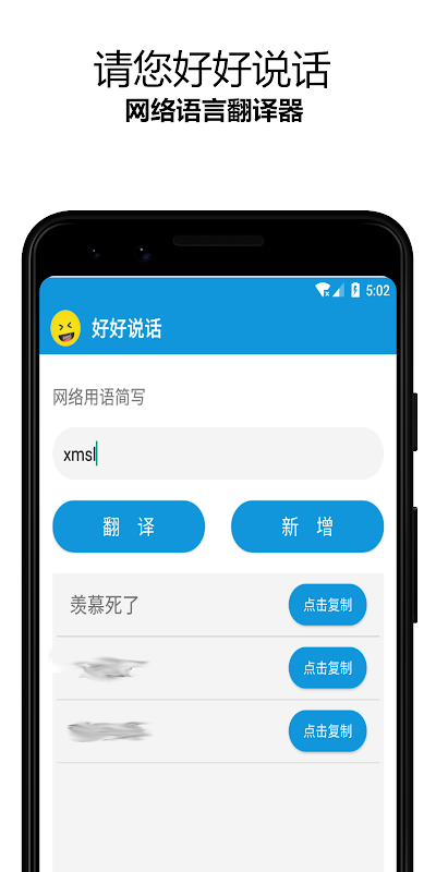 对于70后80后90后来说不在懂得00后的世界了,不知道他们说的什么语言了,对于网络的简写短语也不知其含义,对于此我们开发了这款好好说话-网络语言翻译器。