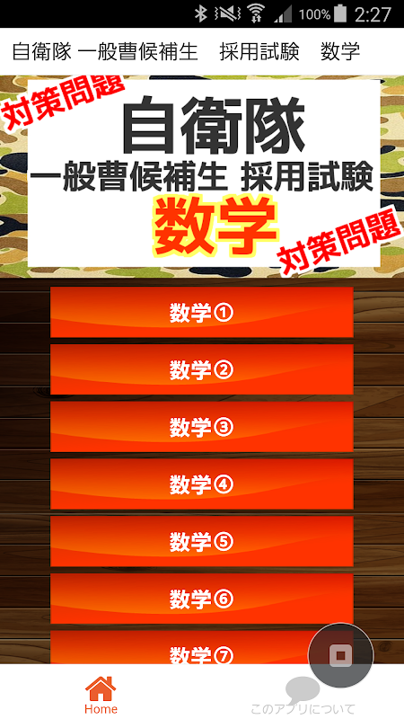 自衛官の一般曹候補生での採用を目指す方に向けた非公式の無料学習アプリです。今回は筆記科目のうち、数学の試験対策です。国家公務員試験対策でも高卒レベルの数学です。自衛官は、陸上・海上・航空自衛隊の曹となる自衛官を養成する制度です。一般曹候補生は、入隊後2年9月以降選考により3曹へ昇任します。自分の能力に合わせて、知 識と技能を高めてゆくことが可能です。一般曹候補生は、26歳まで応募資格があり社会人経験を積んだ方にも広く門戸を開いています。