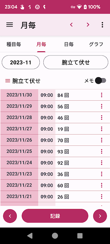 यह बॉडीवेट प्रशिक्षण की घटना, तिथि और संख्या को रिकॉर्ड करने के लिए एक एप्लिकेशन है। आप प्रत्येक घटना के लिए समय की संख्या का एक रेखा ग्राफ़ प्रदर्शित कर सकते हैं।