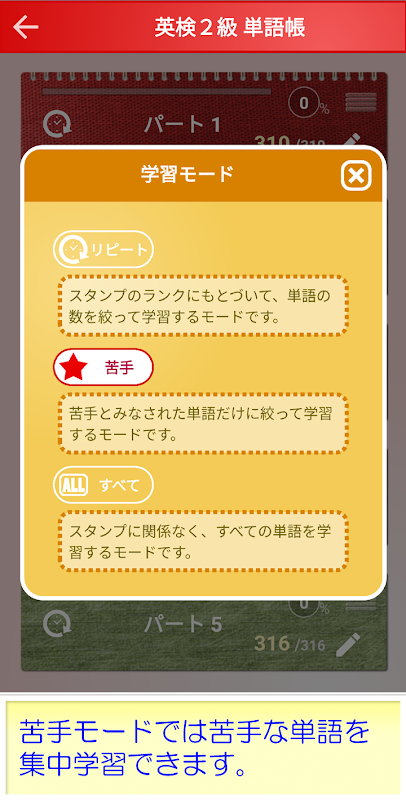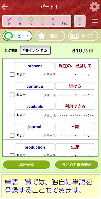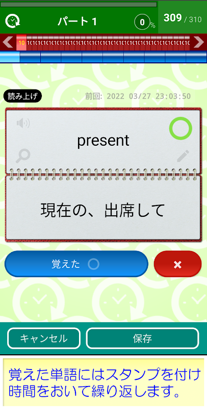 याद किए गए शब्दों को प्रदर्शित नहीं किया जाएगा और एक निश्चित अवधि के बाद बहाल कर दिया जाएगा। यदि आप इसे अभी भी याद करते हैं, तो यह एक ऐसी प्रणाली है जो लंबे समय के बाद समीक्षा को दोहराकर आपकी याददाश्त को स्थापित करती है।