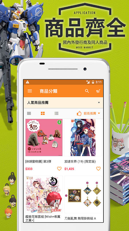 國內外動漫周邊商品與ACG資訊,設計師文創商品的生活行動平台。萌品市集不但橫跨各式平台與行動裝置,更是整合線上的網購宅配便利、線下實體店家銷售服務的安心。