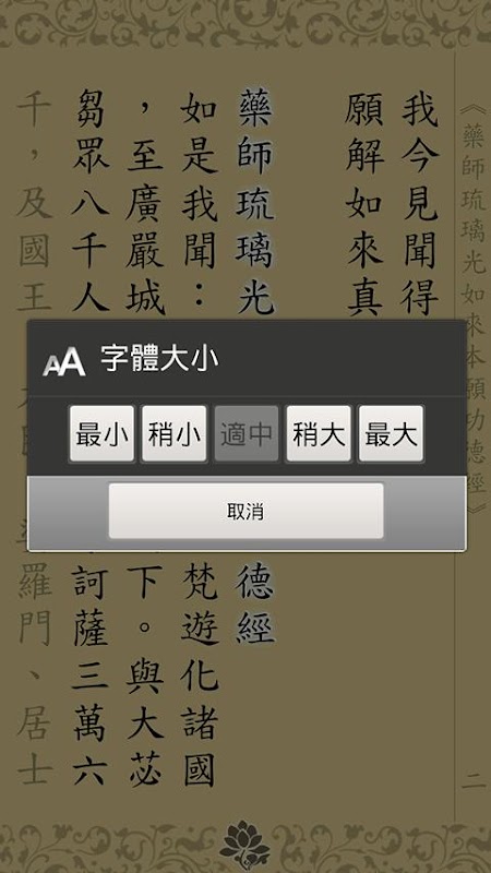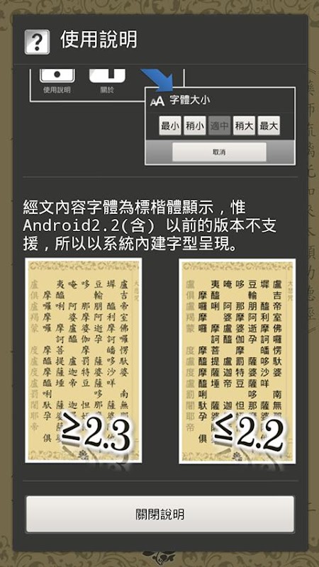 系統設計上除了念誦位置引導、自動翻頁、字體大小調整,也提供了次頁銜接的預覽功能,每頁最後一句為次頁的第一句,如此在翻頁時減少了視覺上或意識上經句銜接上的問題。更多的小細節還需要您下載使用體驗!