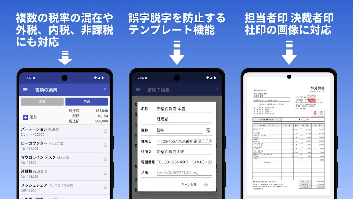 यह एक दस्तावेज़ निर्माण ऐप है जो व्यस्त लोगों को भी अपने खाली समय का प्रभावी ढंग से उपयोग करने की अनुमति देता है, न केवल अनुमान, वितरण नोट और चालान जैसे दस्तावेज़ों का ``आसान निर्माण'' और ``साफ ढंग से आउटपुट'', बल्कि खरीद ऑर्डर, ऑर्डर फॉर्म, कोटेशन अनुरोध, कवर पत्र, रसीदें, आदि, कार्यालय में और यात्रा के दौरान भी।