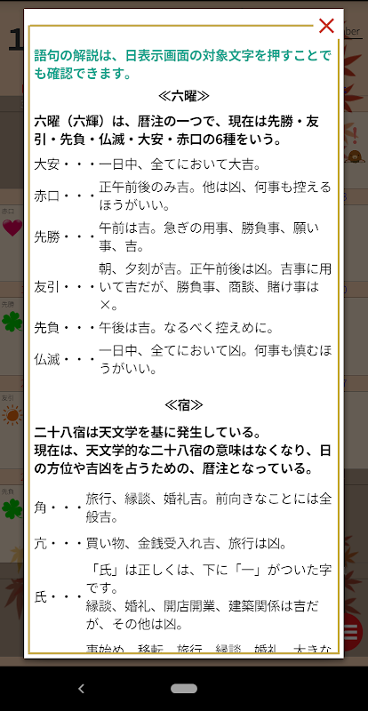 また、各語句(六曜、十二直、二十八宿)については、文字をタップすることにより解説が表示されます。